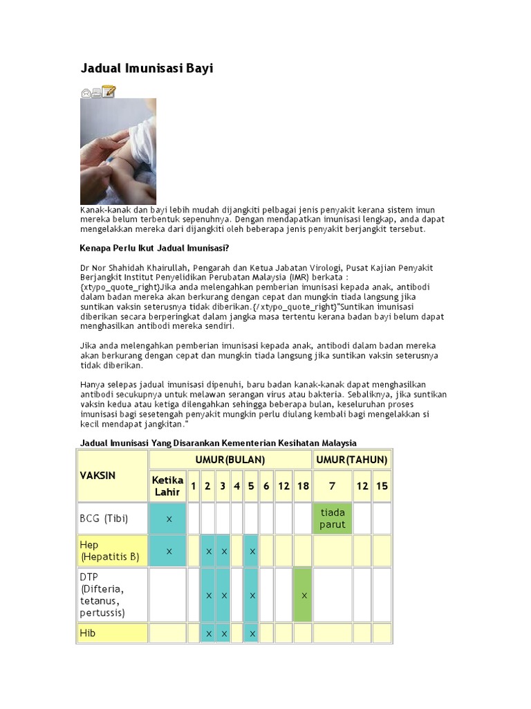 Related : Jadual Imunisasi Bayi 2019 / Ibu Perlu Tahu Ini Jadwal Dan Jenis Imunisasi Terbaru 2020 Dari Idai - Jadual imunisasi untuk bayi di malaysia adalah berdasarkan jadual imunisasi program imunisasi kebangsaan yang dikeluarkan oleh kementerian kesihatan malaysia..